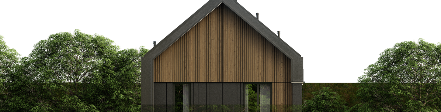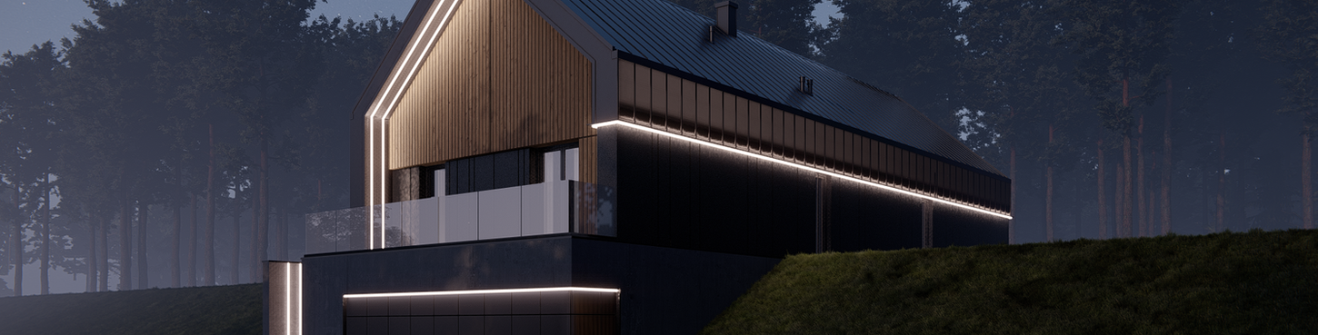 Projekt elewacji nowoczesnej rezydencji w Krakowie. W zamyśle projektu było stworzenie budynku, wpisującego się w otoczenie zalesionego terenu, przy jednoczesnym zastosowaniu chłodniejszego materiału jakim jest beton, który podobał się klientom. Stworzyliśmy elewację, która za dnia dzięki dużej ilości pionowych, drewnianych desek wpisuje się w leśny krajobraz i nadaje harmonii dla nieuporządkowanej bryły budynku. Wyjątkowość projektu polega na tym, że w nocy wygląd elewacji znacząco się zmienia… Udało się to, dzięki zastosowaniu wybiórczej faktury betonowej, którą przysłaniają duże arkusze blachy perforowanej. W nocy zostały podświetlone jedynie betonowe fragmenty elewacji, które są przysłonięte blachą perforowaną, dzięki czemu budynek w nocy zdaje się być surową, betonową bryłą.