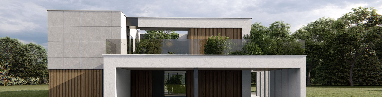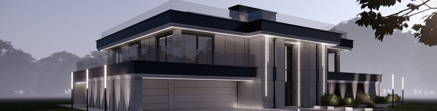 Projekt elewacji ekskluzywnej willi nieopodal Ostrowi Mazowieckiej. Nowoczesna bryła budynku pozwoliła na stworzenie bardzo eleganckiej, a zarazem nowoczesnej elewacji. Zastosowaliśmy beton architektoniczny, lamele kompozytowe, płyty włókno cementowe oraz lustra z tyłu budynku, które nadają monumentalnego wyglądu całej inwestycji. Standardowe rynny zastąpiliśmy łańcuchami, które pełnią tą samą funkcję, a finalny efekt wizualny zdecydowanie podnosi standard wykończenia. Bogate oświetlenie LED znajdujące się wokół całego budynku tworzy nowoczesną i spójną całość. Był to jeden z ciekawszych tegorocznych projektów.