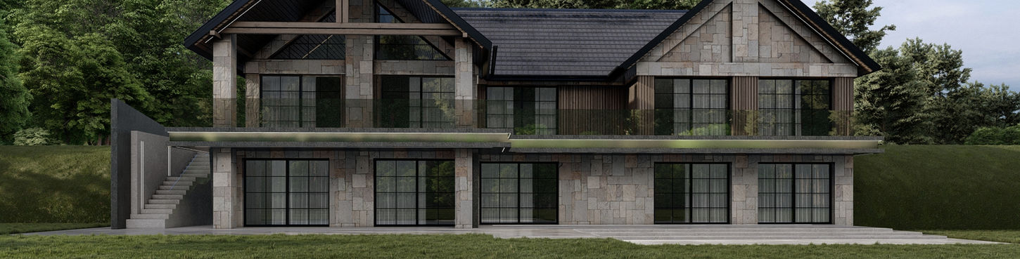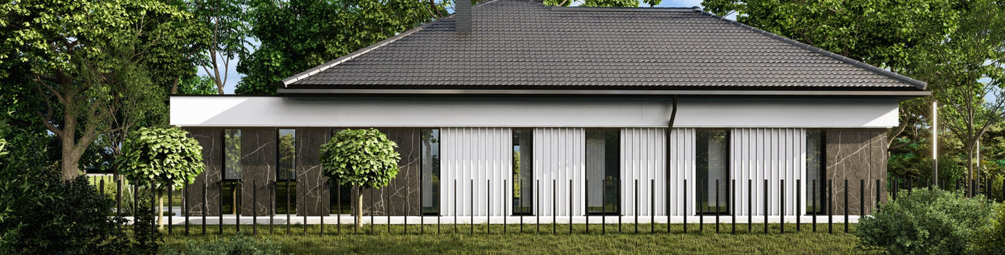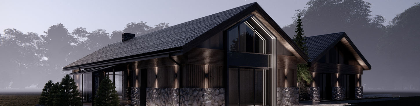 Projekt unikatowej rezydencji. Oczekiwania naszych klientów były wysokie. Chcieli połączyć kilka stylów i finalnie stworzyć unikatowy i wyróżniający się budynek, który swą formą miał przypominać rezydencją/pałac. Zastosowaliśmy czarny tynk dekoracyjny, lamele kompozytowe oraz dużą ilość naturalnego kamienia, którym w tym przypadku jest trawertyn. Nietypowym elementem, który został wprowadzony do projektu na prośbę klientów są zaoblone okna, które w tym przypadku świetnie wpisały się w całą bryłę. budynek. Inwestycja została bardzo mocno przeprojektowana względem pierwotnych założeń. Większość otworów drzwiowych oraz okiennych została tak zaprojektowana, aby była harmonijna z elewacją oraz wnętrzem budynku. Względem pierwotnych założeń doprojektowaliśmy rownież prawe skrzydło budynku, czyniąc budynek bardziej proporcjonalny oraz okazały Budynek został dobrze doświetlony, poprzez zastosowanie dużej ilości oświetlenia LED, co znacznie wpływa na odbiór całej zaprojektowanej formy.