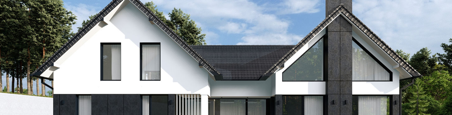 Projekt elewacji nowoczesnej willi. Zastosowaliśmy jasną kolorystykę ozdobioną bogatą sztukaterią elewacyjną, którą skontrastowaliśmy z dominantą w postaci czarnej płyty fasadowej, imitującej marmur. Bogate oświetlenie LED znajdujące się pod okapami dachowymi oraz w górnej części elewacji frontowej tworzy nowoczesną i spójną całość.